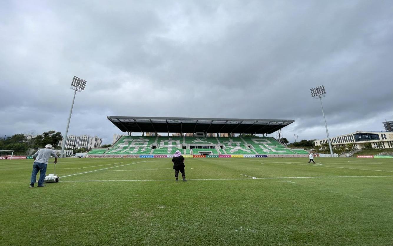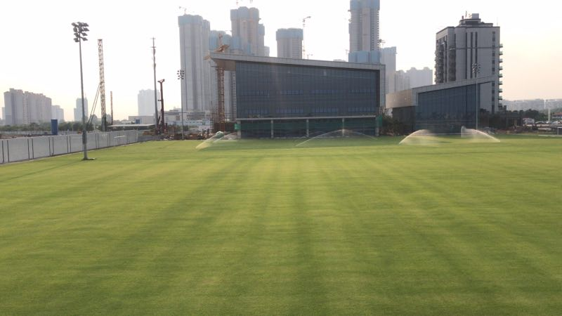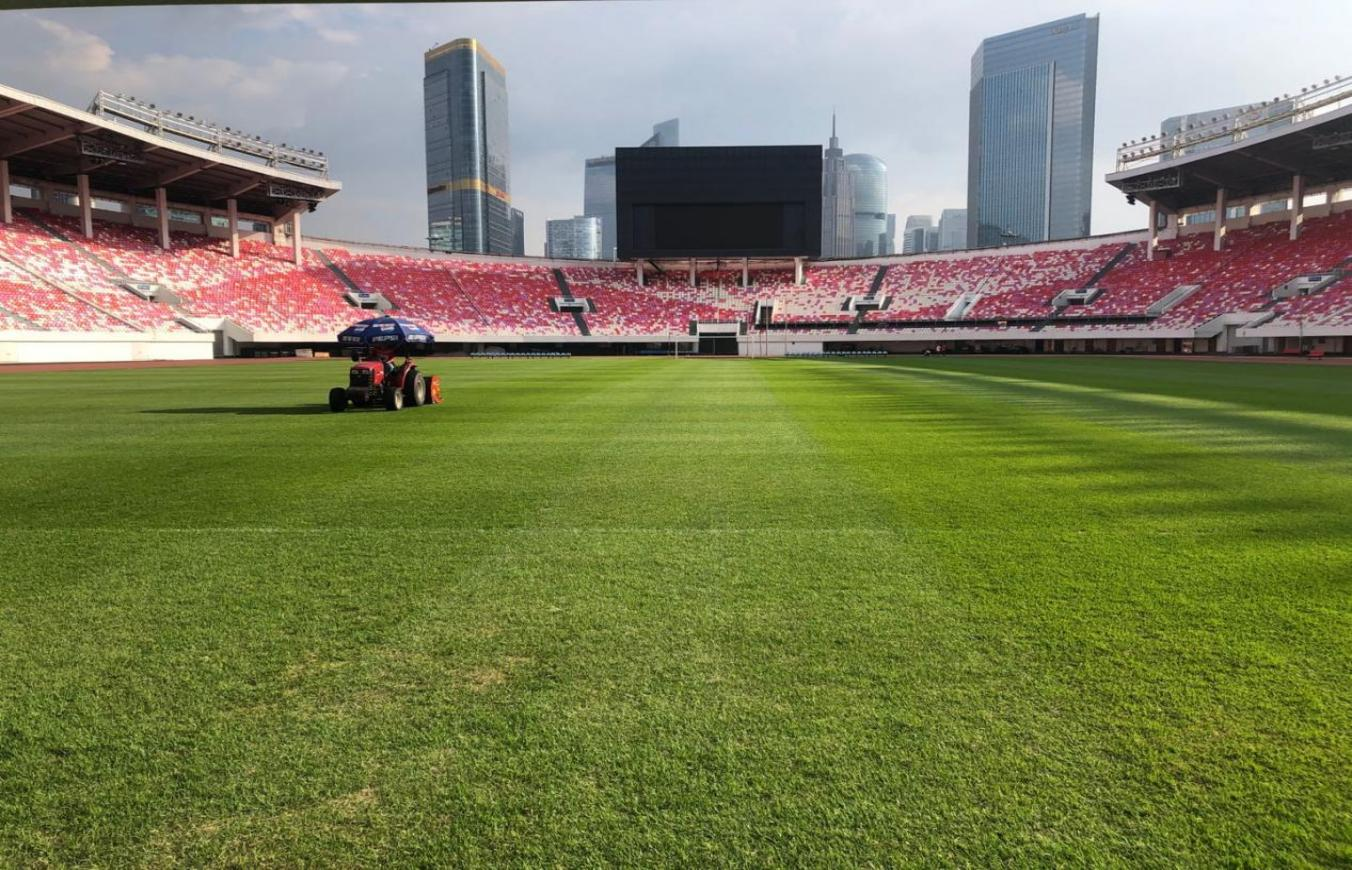 广州大学城体育中心体育场主场足球场地,面积:8000平方米,我司完成成坪兰引三号沙基天然草草毯供货及铺设服务,负责铺设后一个月草毯养护,场地标准:达到中超联赛比赛场地要求